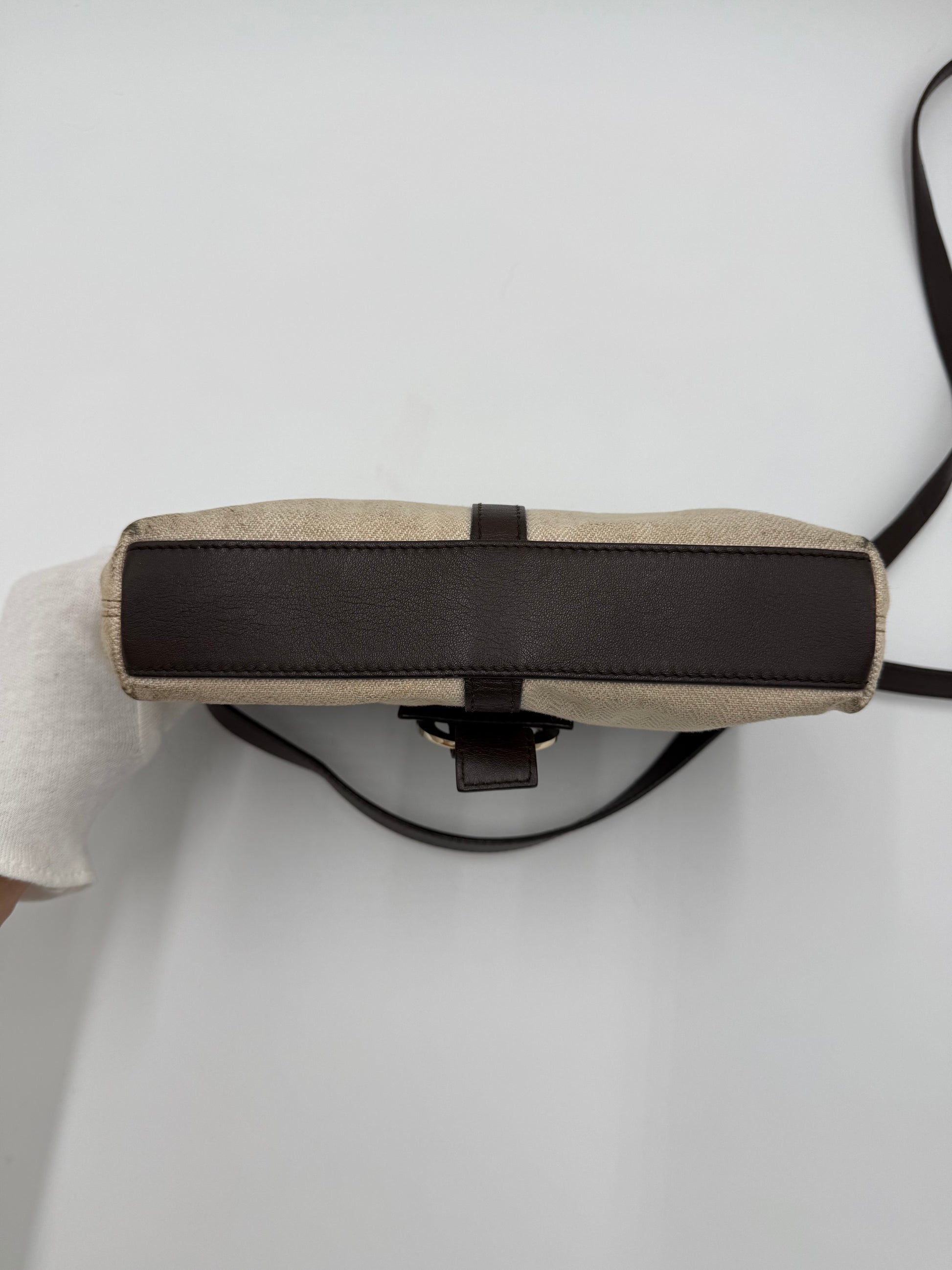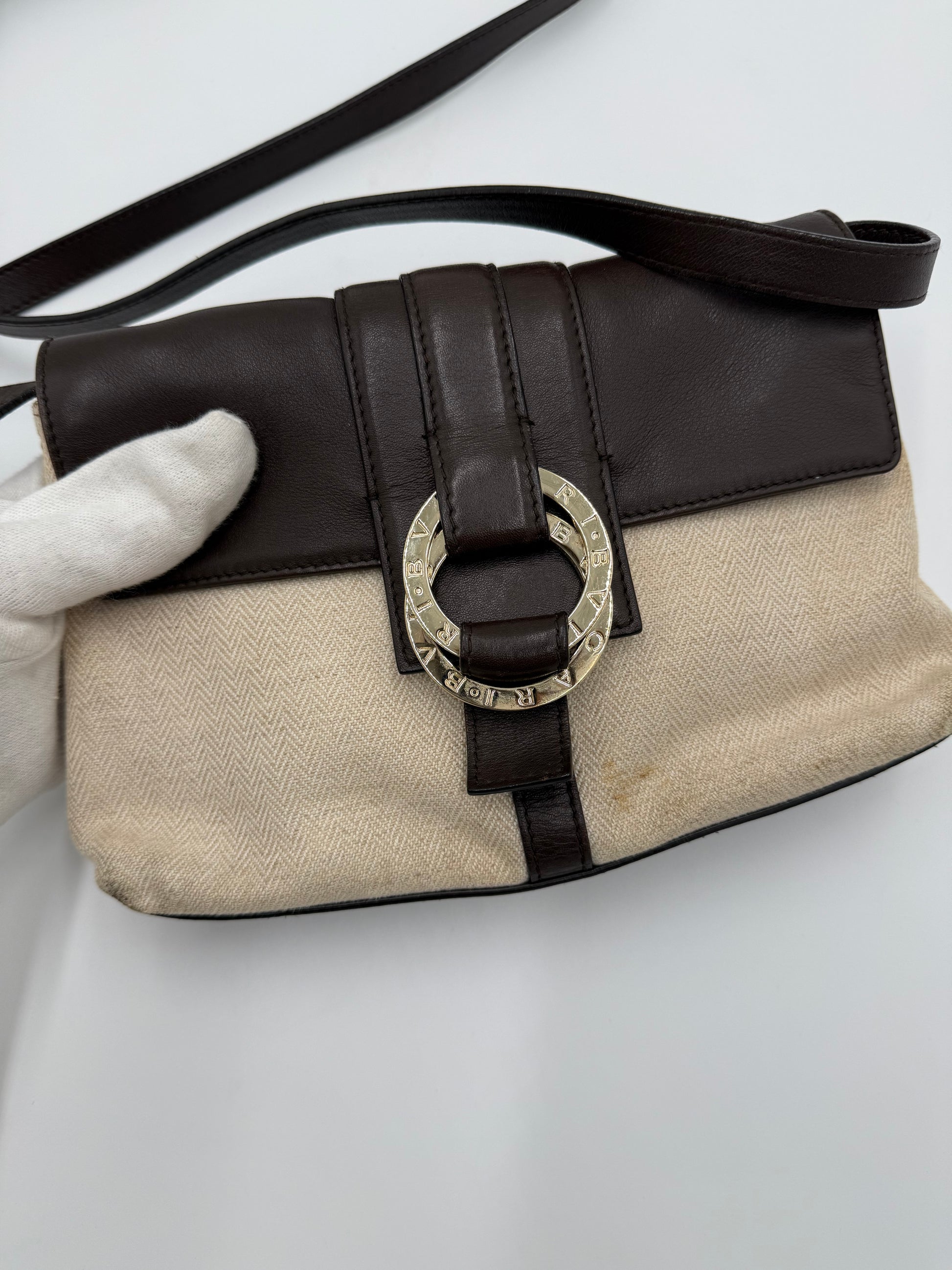 Bulgari Borsa a Spalla in Tela Chevron e Pelle Marrone. Modello caratterizzato dalla lavorazione in tela con motivo Chevron beige, in netto contrasto con la patta e le finiture in pelle liscia marrone scuro. Il dettaglio distintivo è l'emblematica fibbia circolare in metallo argentato sulla patta, con l'incisione del logo Bvlgari. L'interno è foderato in tessuto con tasca zip. Venduta co dustbag originale.