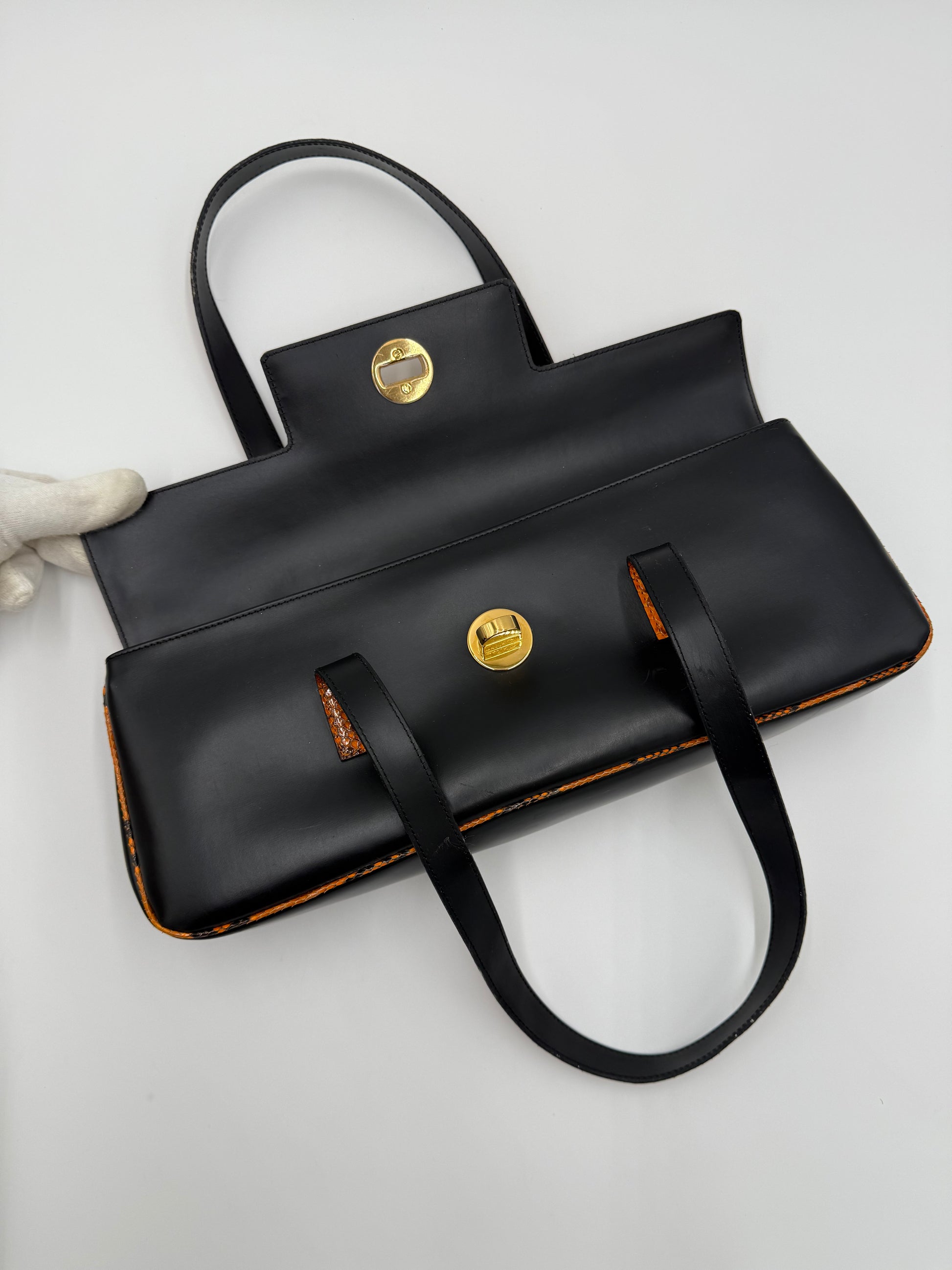 Bulgari Borsa Vintage in Pelle di Serpente Arancione e Pelle Nera. Modello caratterizzato dall'audace contrasto bicolore e dal design rigido. La borsa è realizzata con il corpo principale in pelle nera liscia e finiture, manico e patta in pregiata pelle esotica di serpente nella vibrante tonalità arancione ambra e nero. Chiusura con medaglione logo Bulgari rotondo.