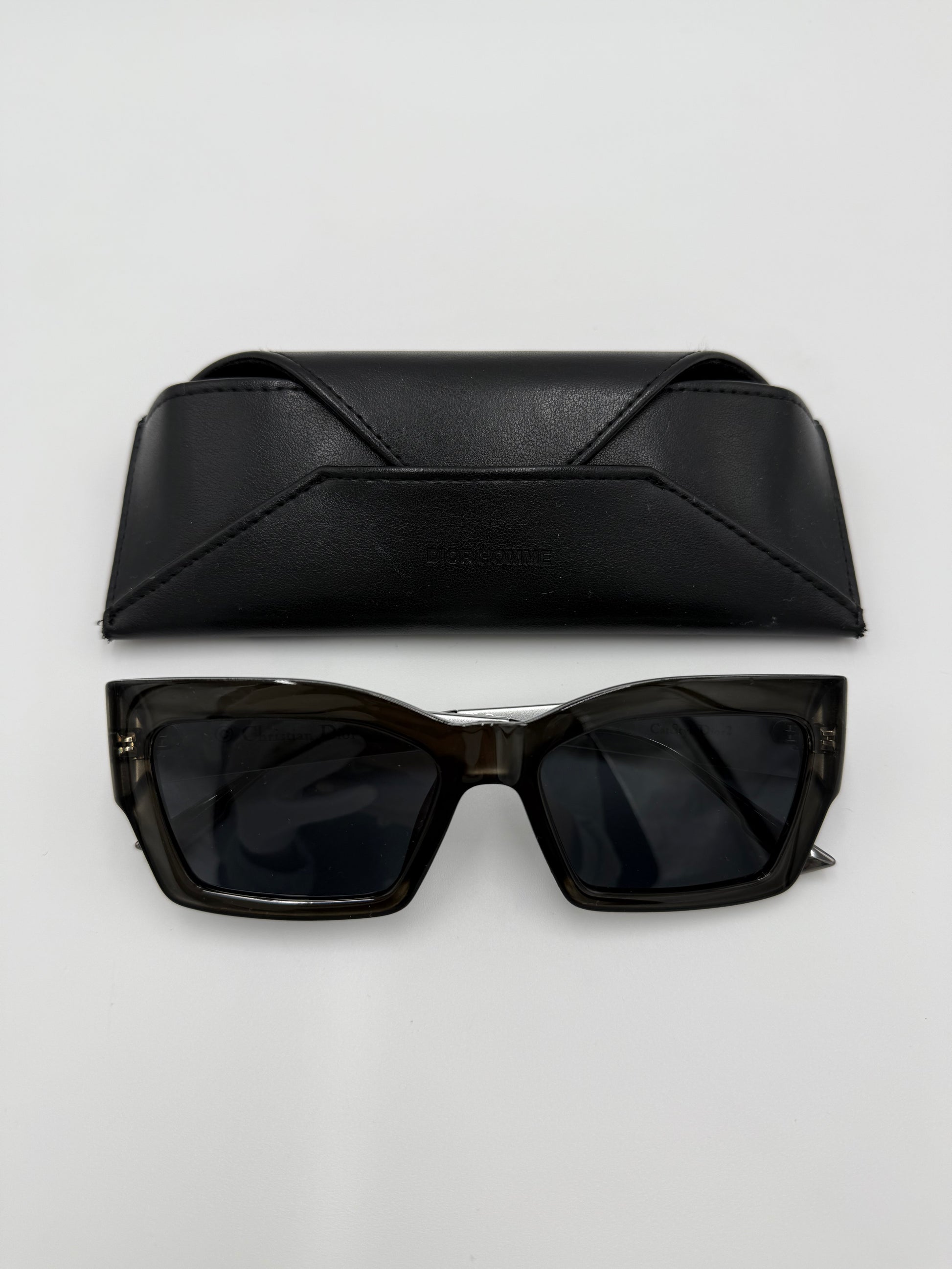 Dior Occhiali da Sole Catstyle Dior 2 Grigio Scuro. La montatura presenta una forma rettangolare leggermente geometrica e oversize, realizzata in acetato con una finitura traslucida color grigio scuro. Le lenti scure offrono protezione UV400. Le aste sono sottili e presentano la firma incisa. Vengono venduti con la loro custodia rigida originale in pelle nera.