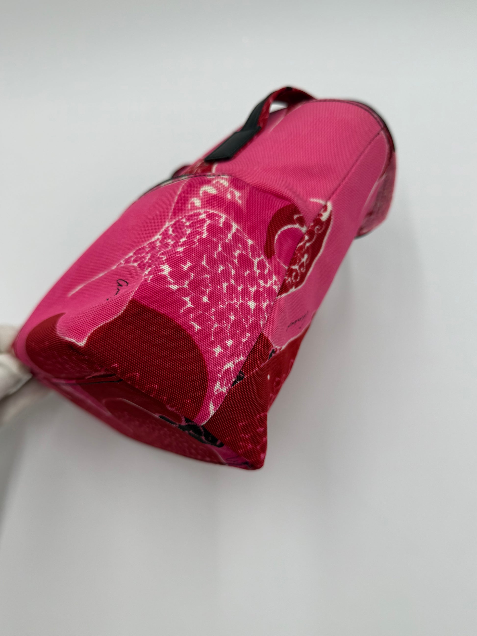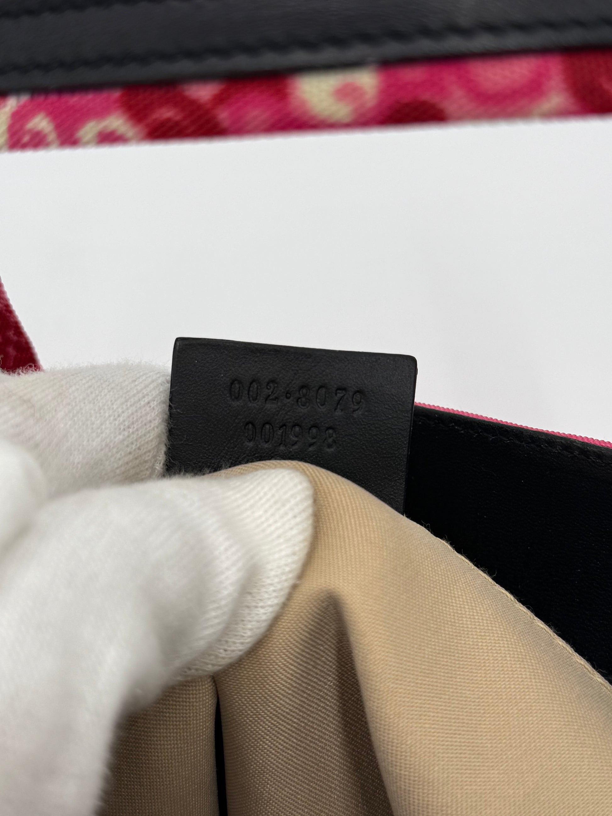 Gucci Borsa a Mano Vintage 1999 Acid Flower in Tela Floreale. Modello by Tom Ford anni '90, compatto e vivace, caratterizzato da un'audace stampa floreale nei toni del rosa acceso e del rosso. La borsa è realizzata in tela resistente, rifinita con eleganti manici e bordi in pelle nera a contrasto. Presenta un design a mini tote, con chiusura principale superiore a cerniera. L'interno è foderato in tessuto beige con tasca interna con cerniera, mentre l'esterno è impreziosito da una pratica tasca frontale con zip. Venduta con dustbag originale.