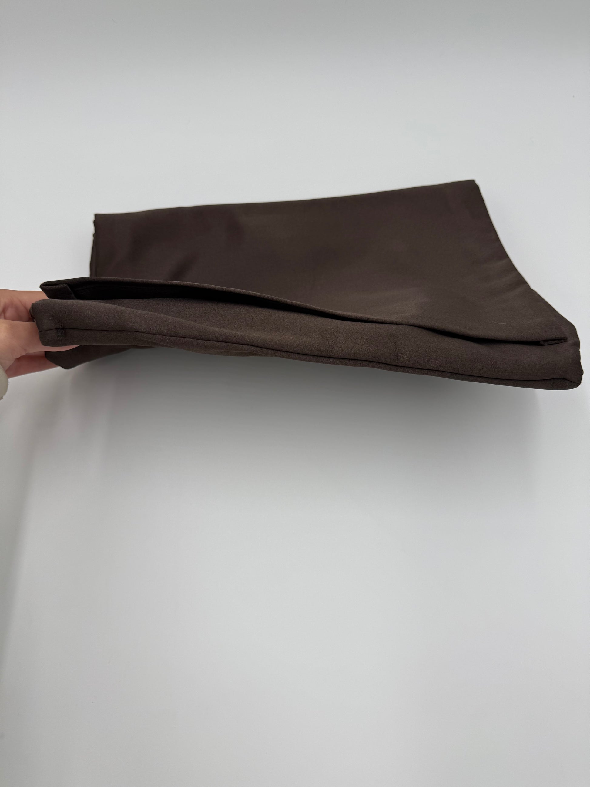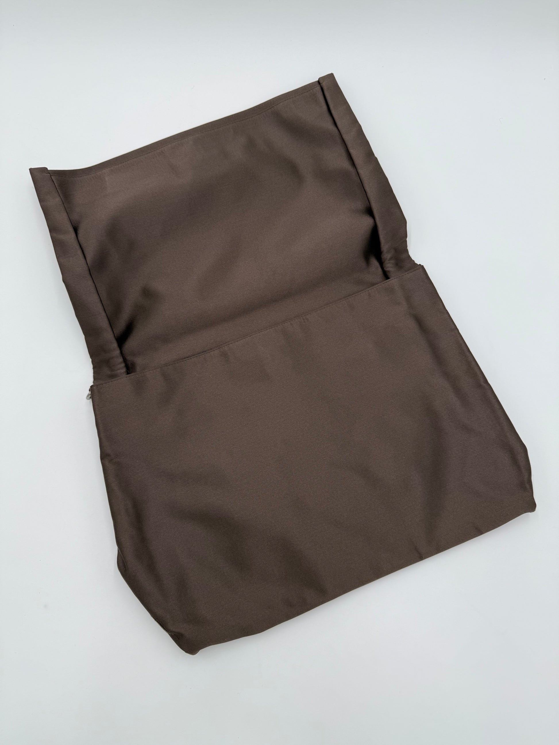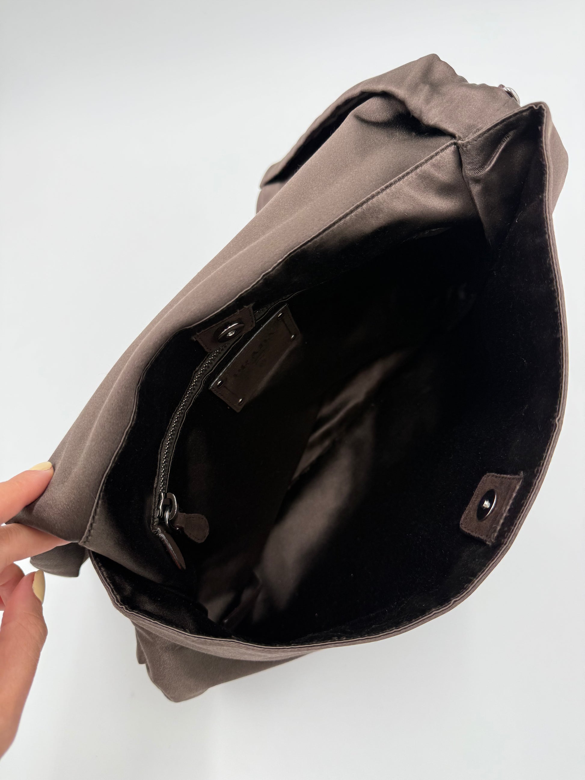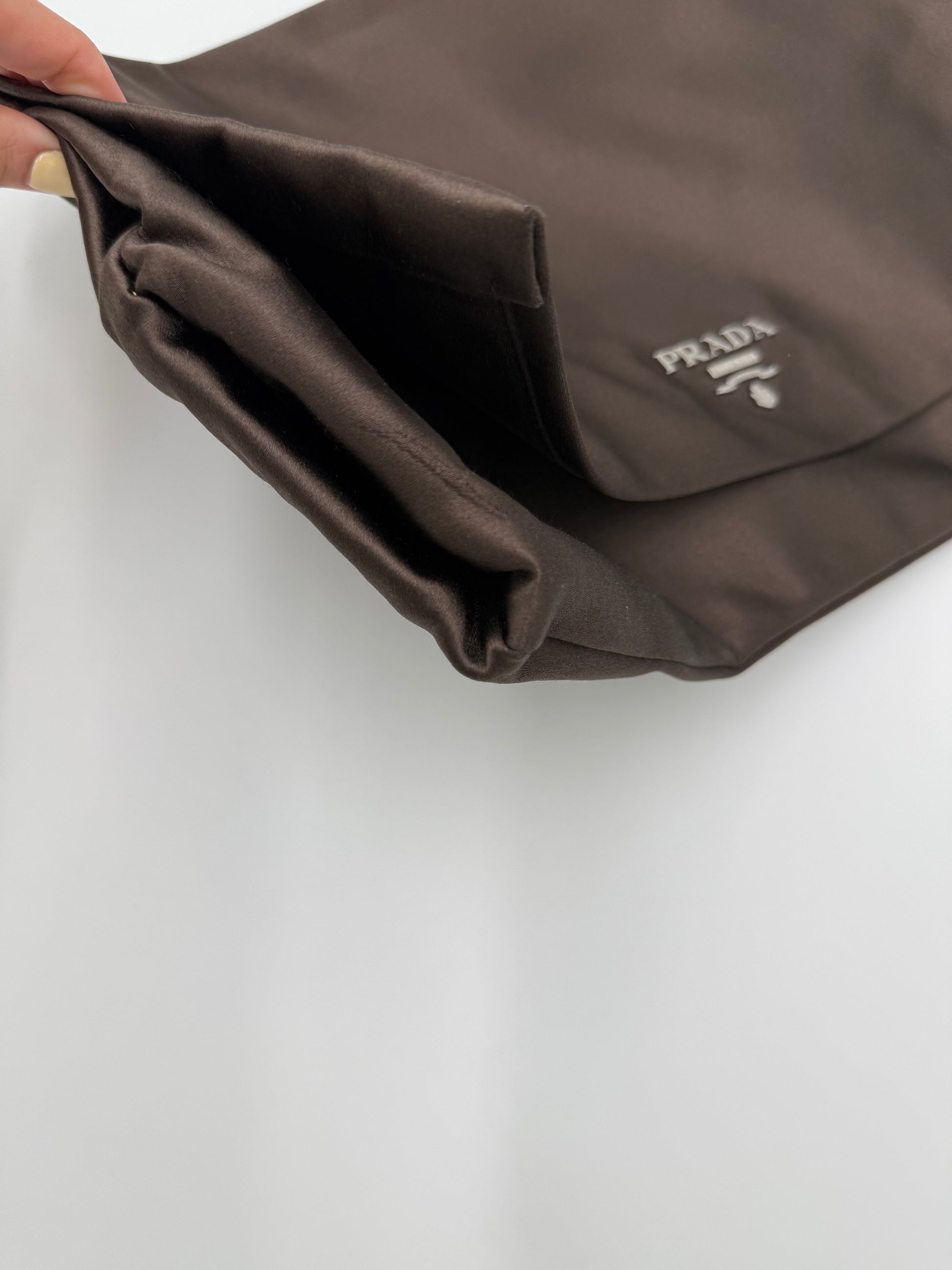 Prada Pochette Vintage Grande in Raso Marrone. Il modello presenta una silhouette morbida e piatta, interamente realizzato in un lussuoso raso di seta color marrone cioccolato. La chiusura principale è a pressione con bottone, mentre l'interno è foderato in raso dello stesso colore. All'interno è presente una tasca con cerniera, con la targhetta in pelle del logo Prada applicata.