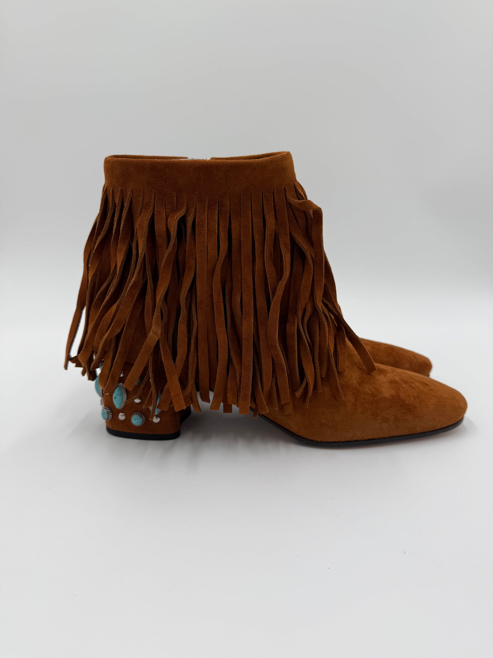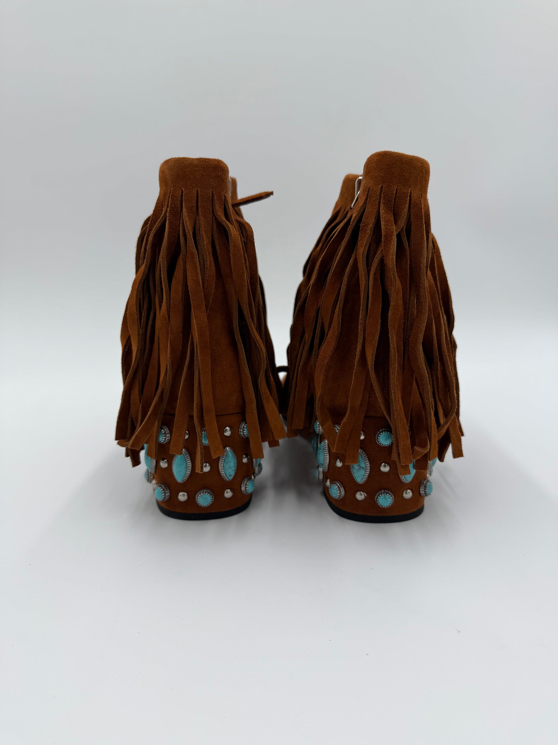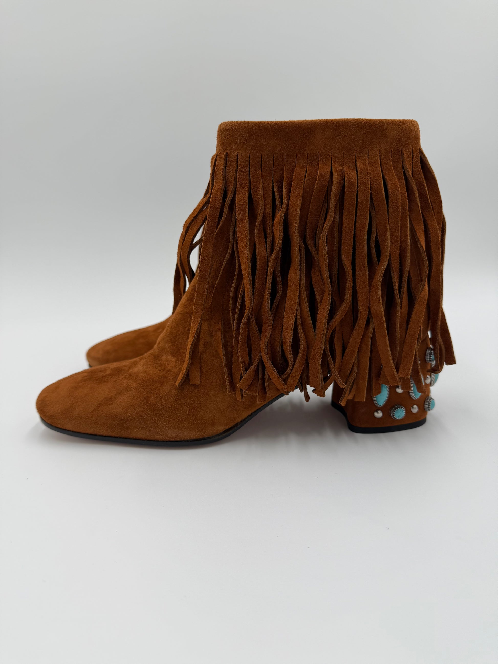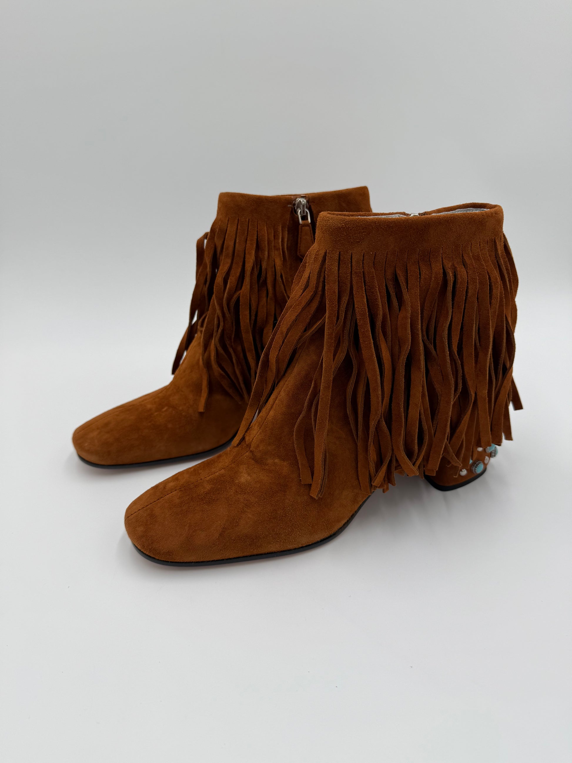 Prada Stivaletti in Camoscio Marrone con Frange e Tacco Gioiello. Realizzati in morbido camoscio color cuoio, questi ankle boots presentano una tomaia ricoperta da abbondanti frange che aggiungono movimento e carattere. Il dettaglio distintivo è il tacco robusto e basso che funge da vero e proprio tacco gioiello, decorato con borchie in metallo e pietre color turchese. La silhouette è affusolata con una punta leggermente squadrata. Venduti con scatola.