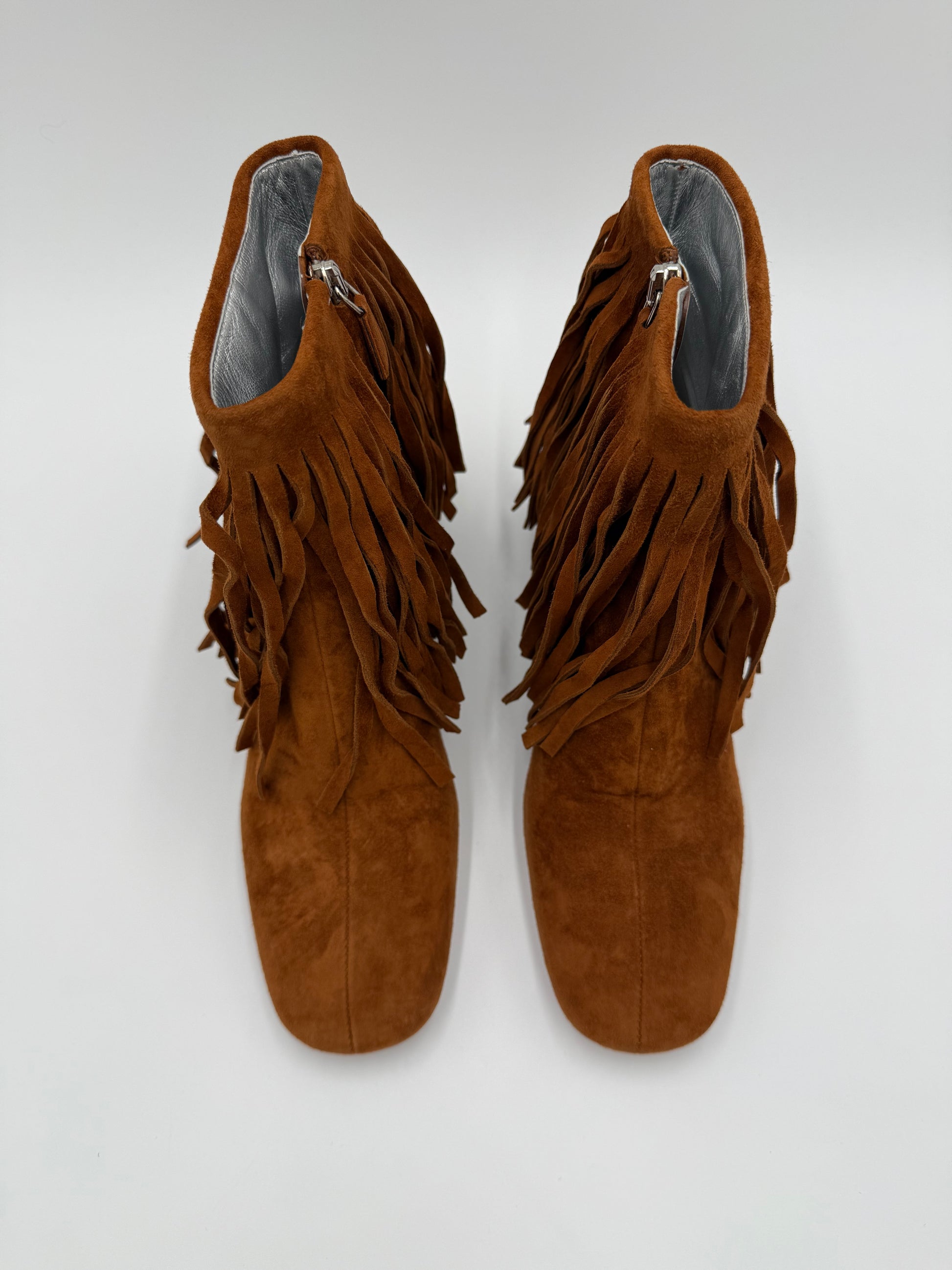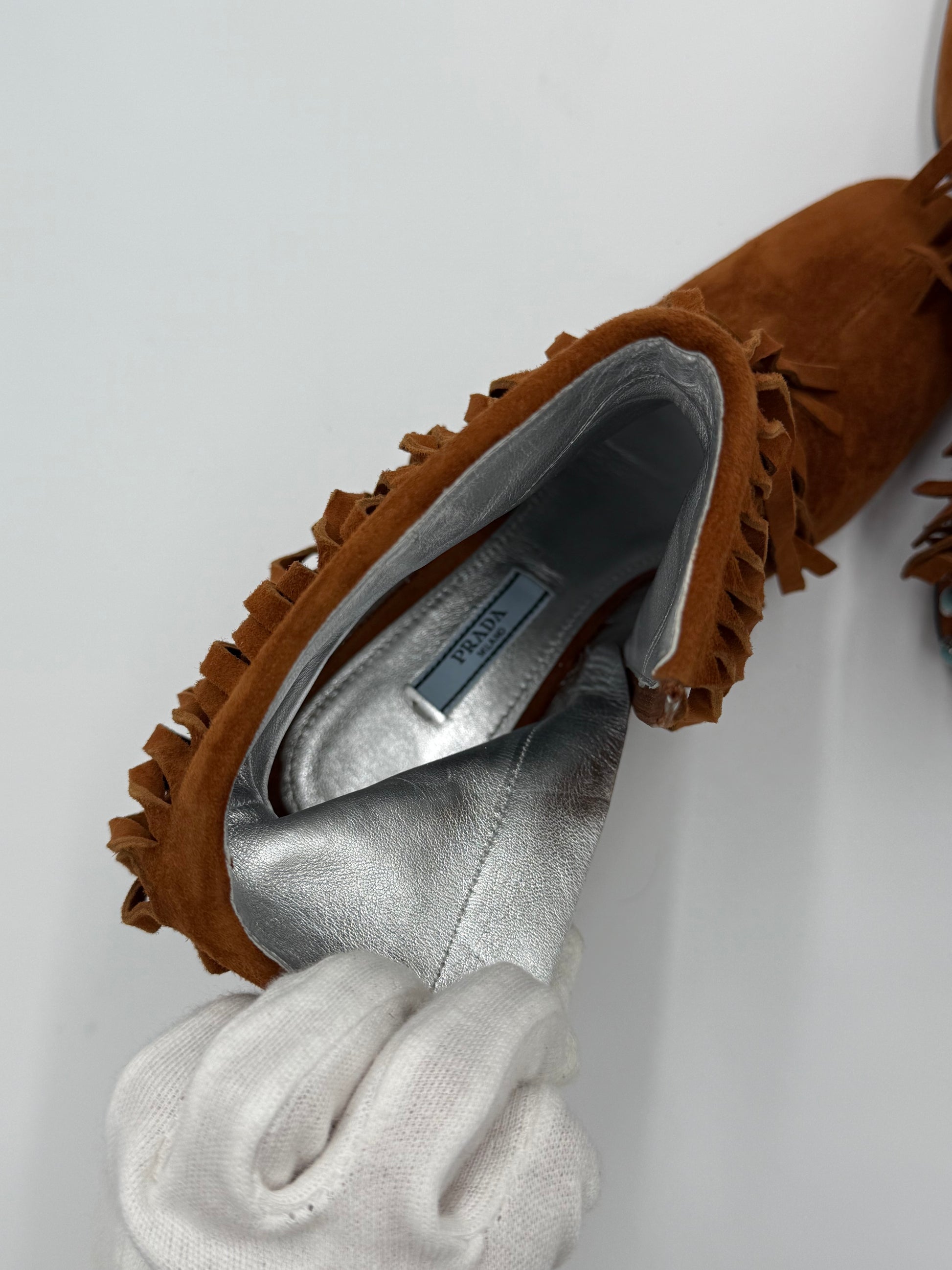 Prada Stivaletti in Camoscio Marrone con Frange e Tacco Gioiello