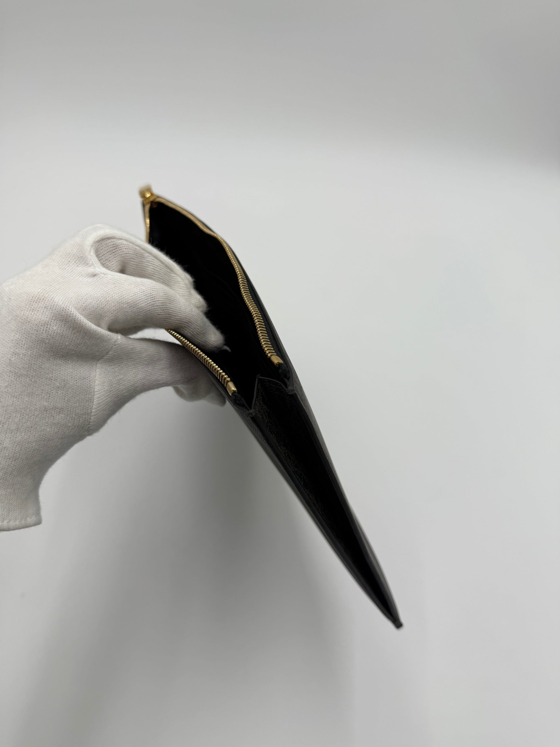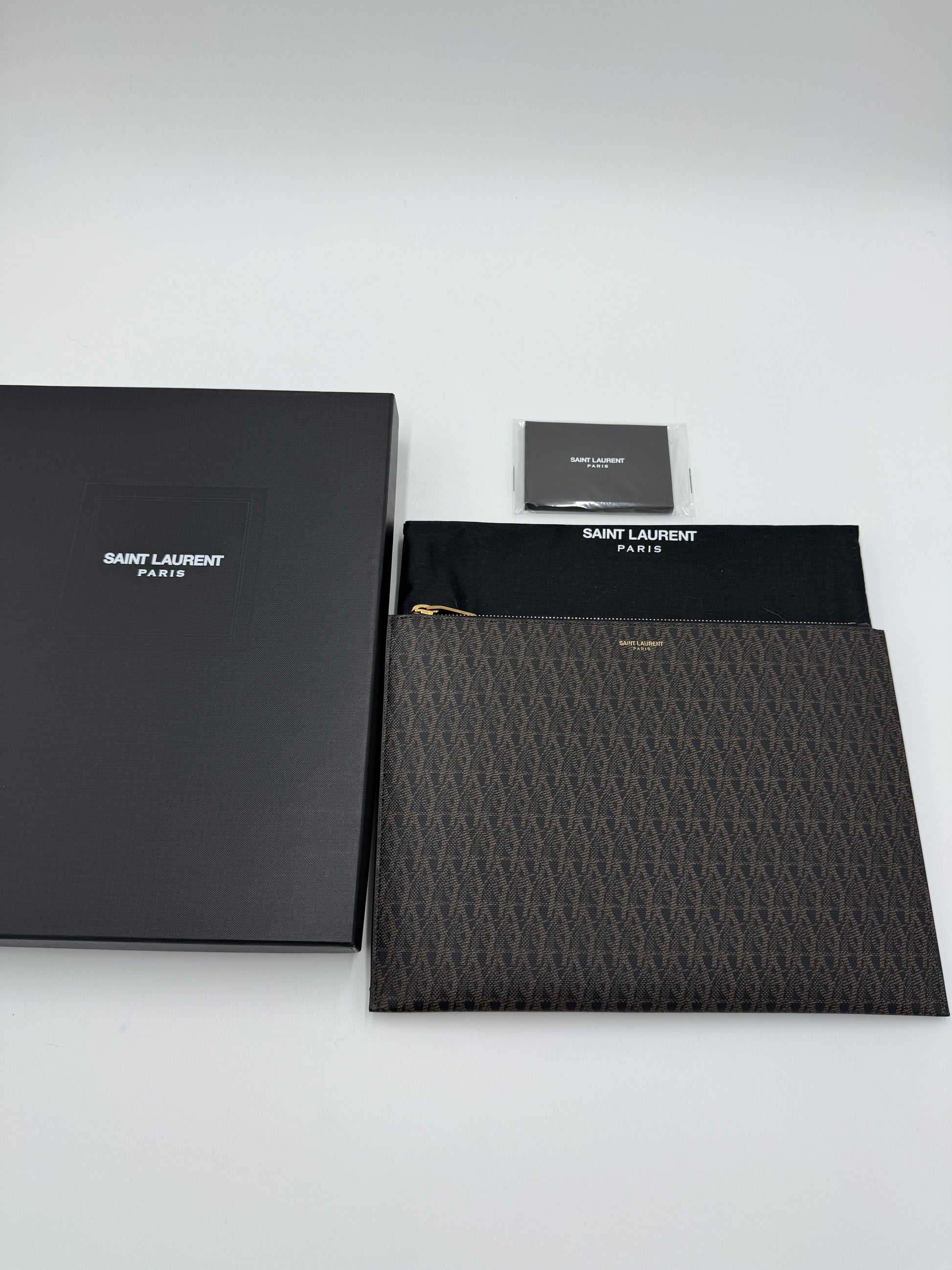 Saint Laurent Pouch Classic Toile Monogram Marrone. Realizzata in resistente canvas con il distintivo motivo monogram YSL nei toni del marrone scuro e nero. La silhouette piatta e sottile la rende perfetta come clutch da sera o come custodia chic all'interno di una borsa più grande. Chiusura con cerniera dorata, interno foderato in tessuto nero, organizzato con scomparti portacarte e tasche piatte. Venduta nella sua scatola originale con dustbag.