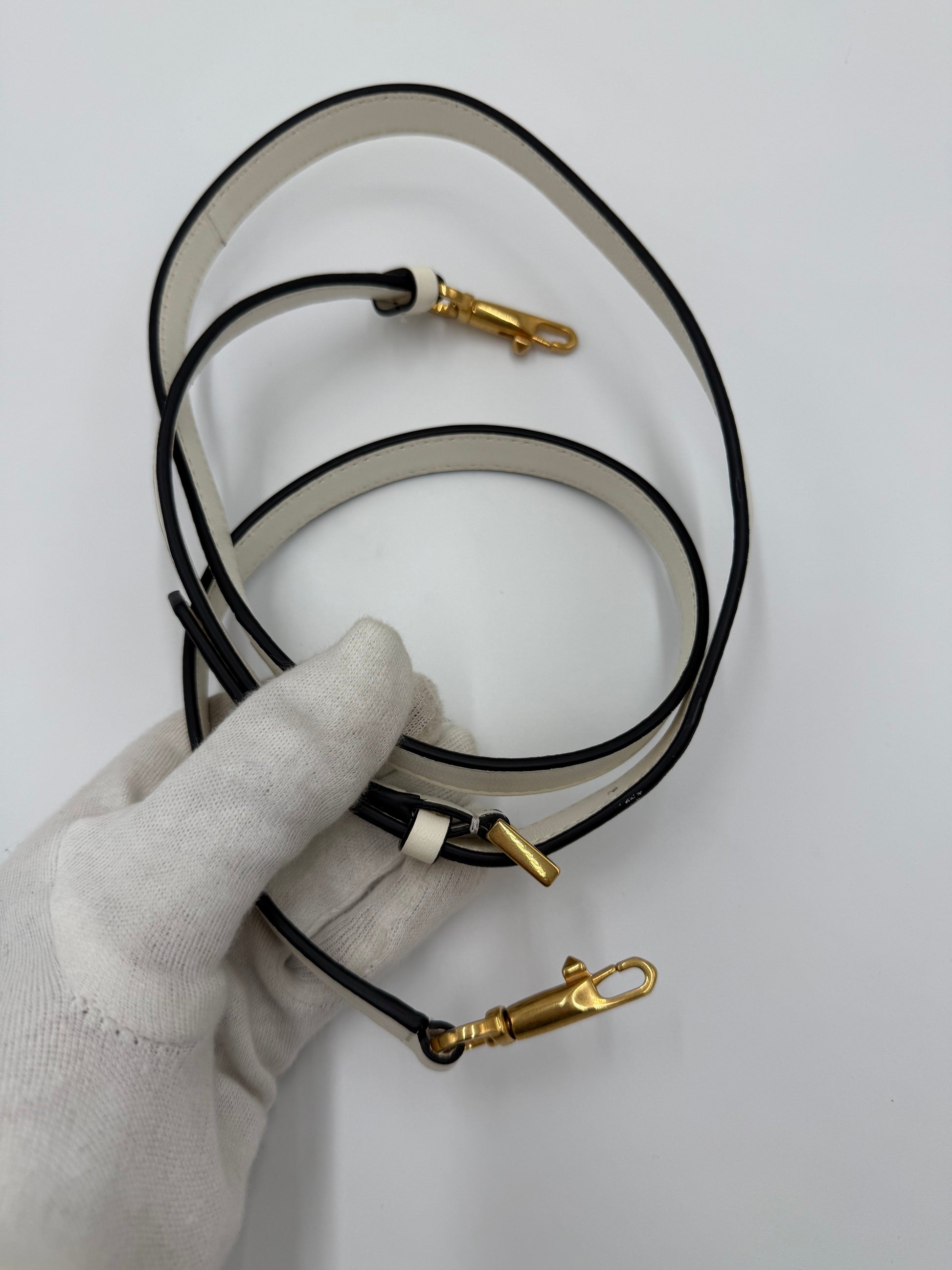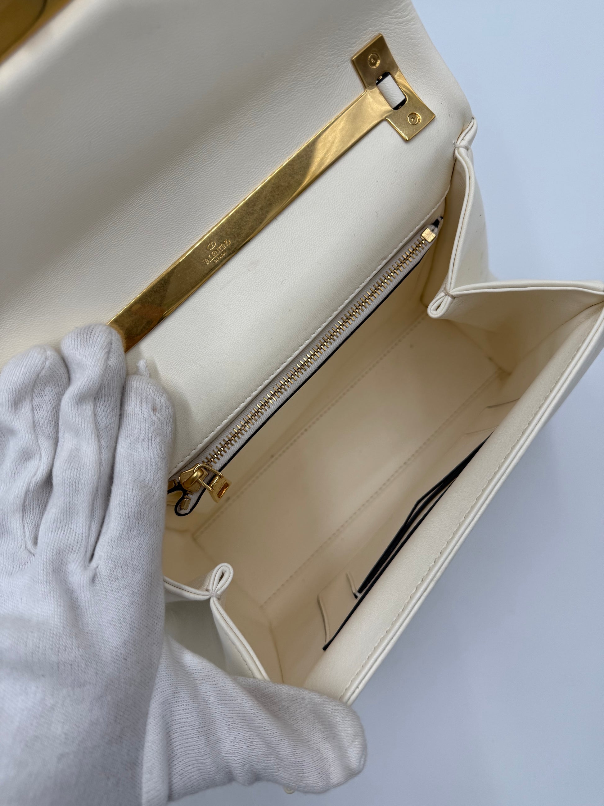Valentino Garavani Borsa One Stud Top Handle in Pelle Avorio. Realizzata in pelle color avorio, presenta un design minimalista e raffinato. Il tratto distintivo è la maxi borchia piramidale in metallo dorato anticato posizionata al centro della patta, con cuciture che formano un elegante motivo a diamante. È dotata di un manico superiore rigido in pelle e di una tracolla removibile e regolabile in pelle. L'interno è foderato in pelle chiara e include due tasche di cui una tasca con cerniera. Venduta con dustbag originale.