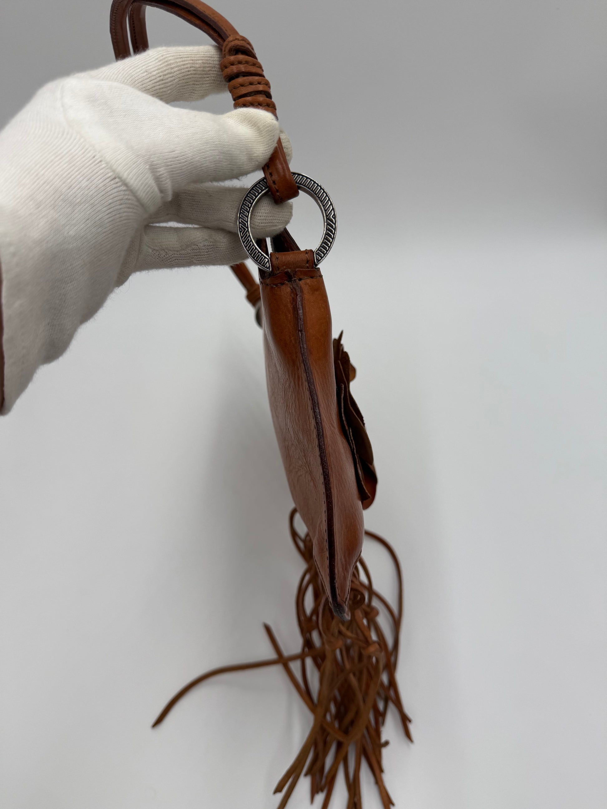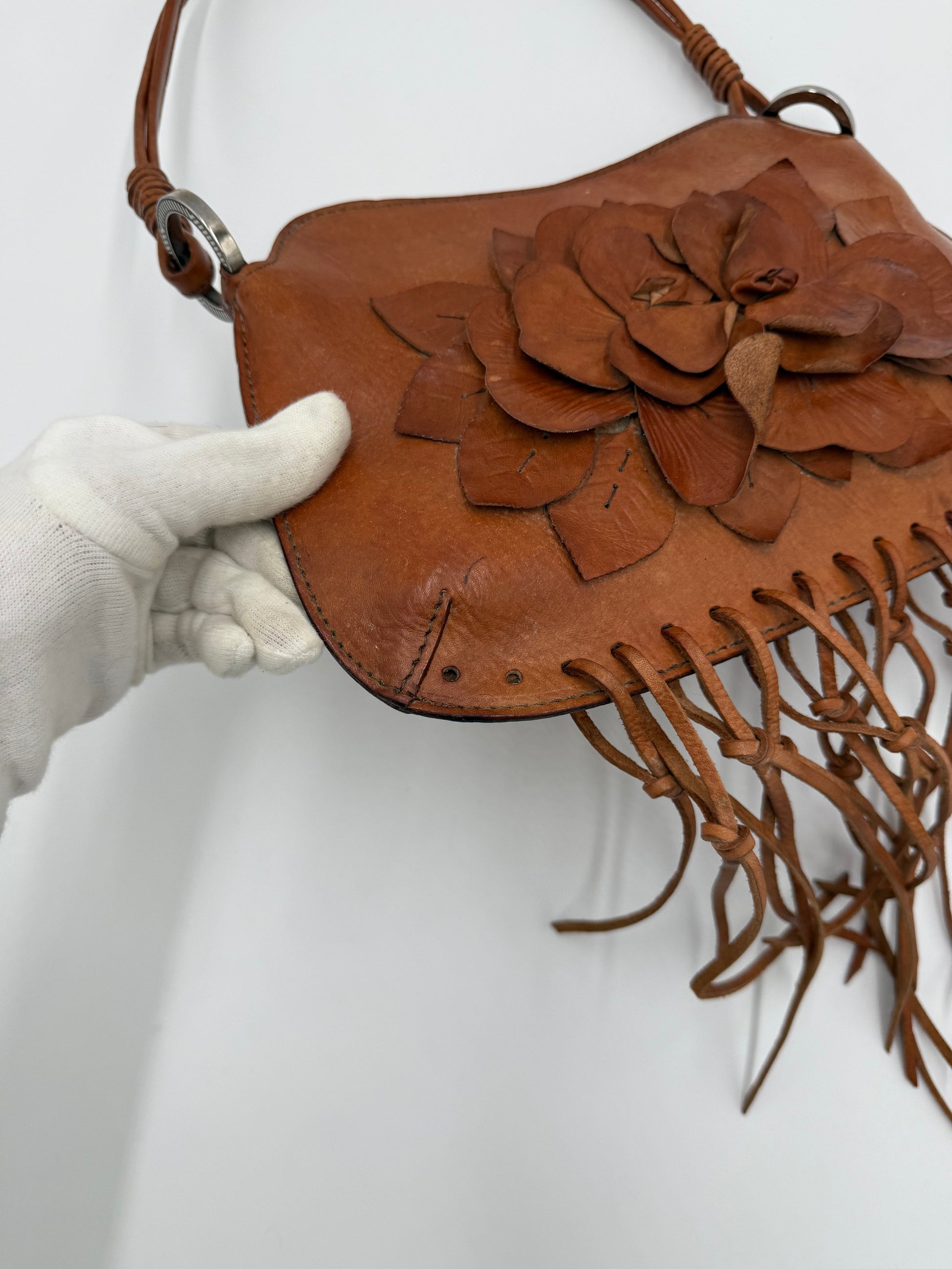 Valentino Garavani Borsa Vintage a Spalla in Pelle con Frange Marrone. Modello caratterizzato dalla lavorazione in pelle martellata color marrone cuoio, costruzione morbida con distintiva applicazione floreale tridimensionale sul fronte. Design boho vivace con frange in pelle al fondo ed interno foderato in vibrante raso azzurro.